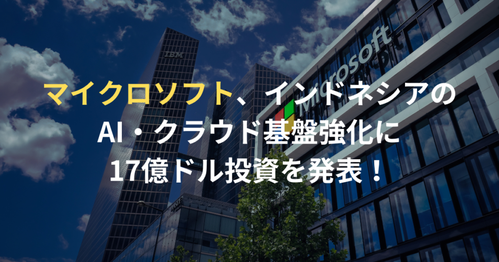 マイクロソフトが、インドネシアのAI(人工知能)とクラウド基盤を強化するため、今後4年間で17億ドルを投資することを発表しました。この巨額投資は、同国のデジタルインフラを整備し、高まるクラウドコンピューティングサービスへの需要に応えることを目... -